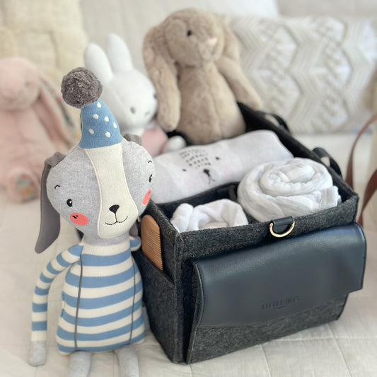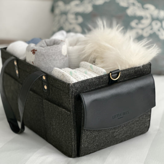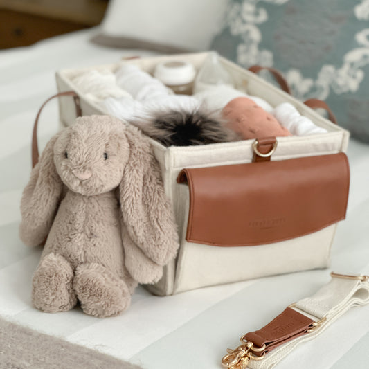Crafted with premium felt and soft vegan leather, it seamlessly transitions from a nappy caddy to a hospital bag, diaper bag, pram caddy to an everyday personal orgainser or travel essential.